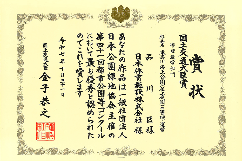 東品川海上公園(屋上庭園)は、品川区より日本体育施設(株)が業務委託を受託し、管理運営を行っています。コンクールには、品川区様と当社の連名で応募しました。