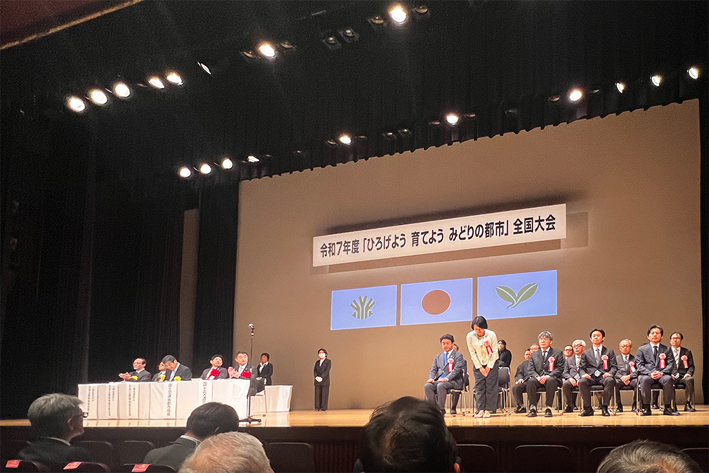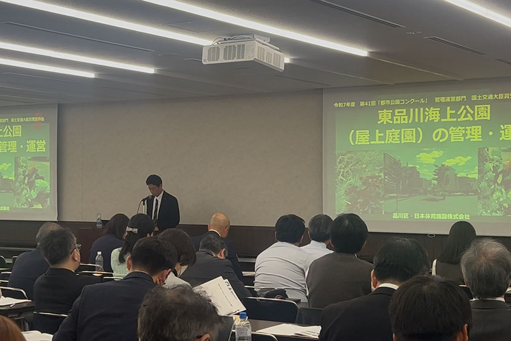 表彰式は、10月31日にニッショーホールで開催された「ひろげよう 育てよう みどりの都市」全国大会(主催/一般社団法人日本公園緑地協会)にて行われ、品川区森澤区長がご出席されました。事例発表会では当社のパークマネージメント事業部高橋部長が報告を行いました。