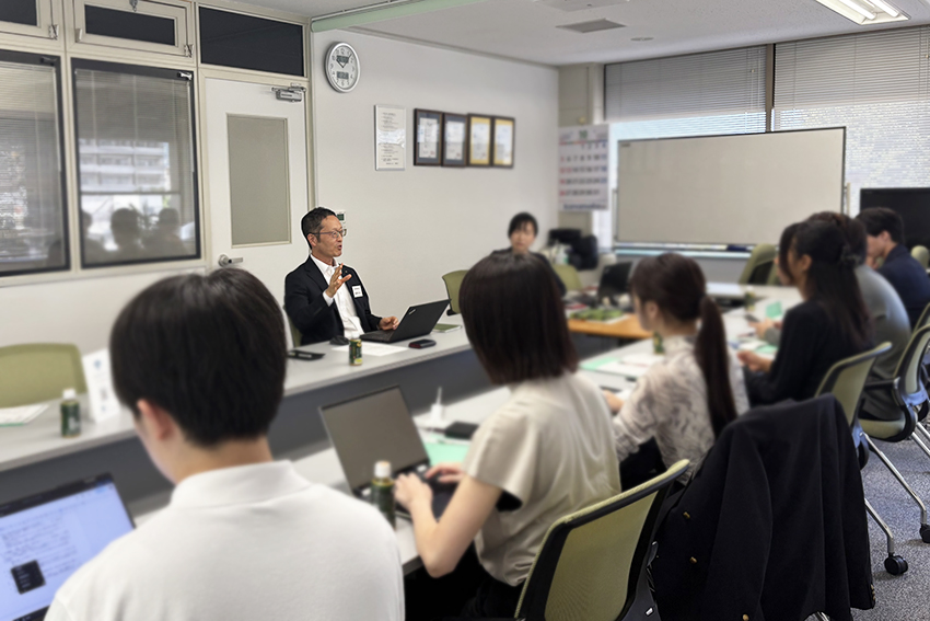 学生からの質問に対し、代表取締役社長の越後が、時代の変化の中においても創業当初から変わらない価値観、創立54年の歩みと取り組みについてお話ししました。