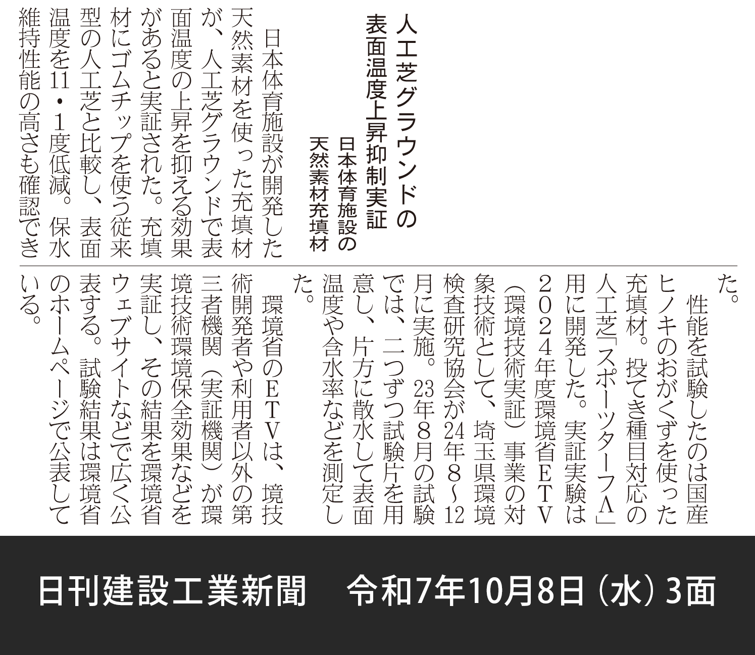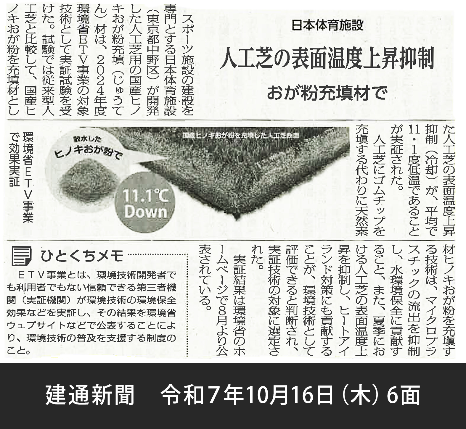 日刊建設工業新聞他に当社が開発した国産『ヒノキおが粉』の充填材(『スポーツターフΛ(ラムダ)』用)の記事が掲載されました。