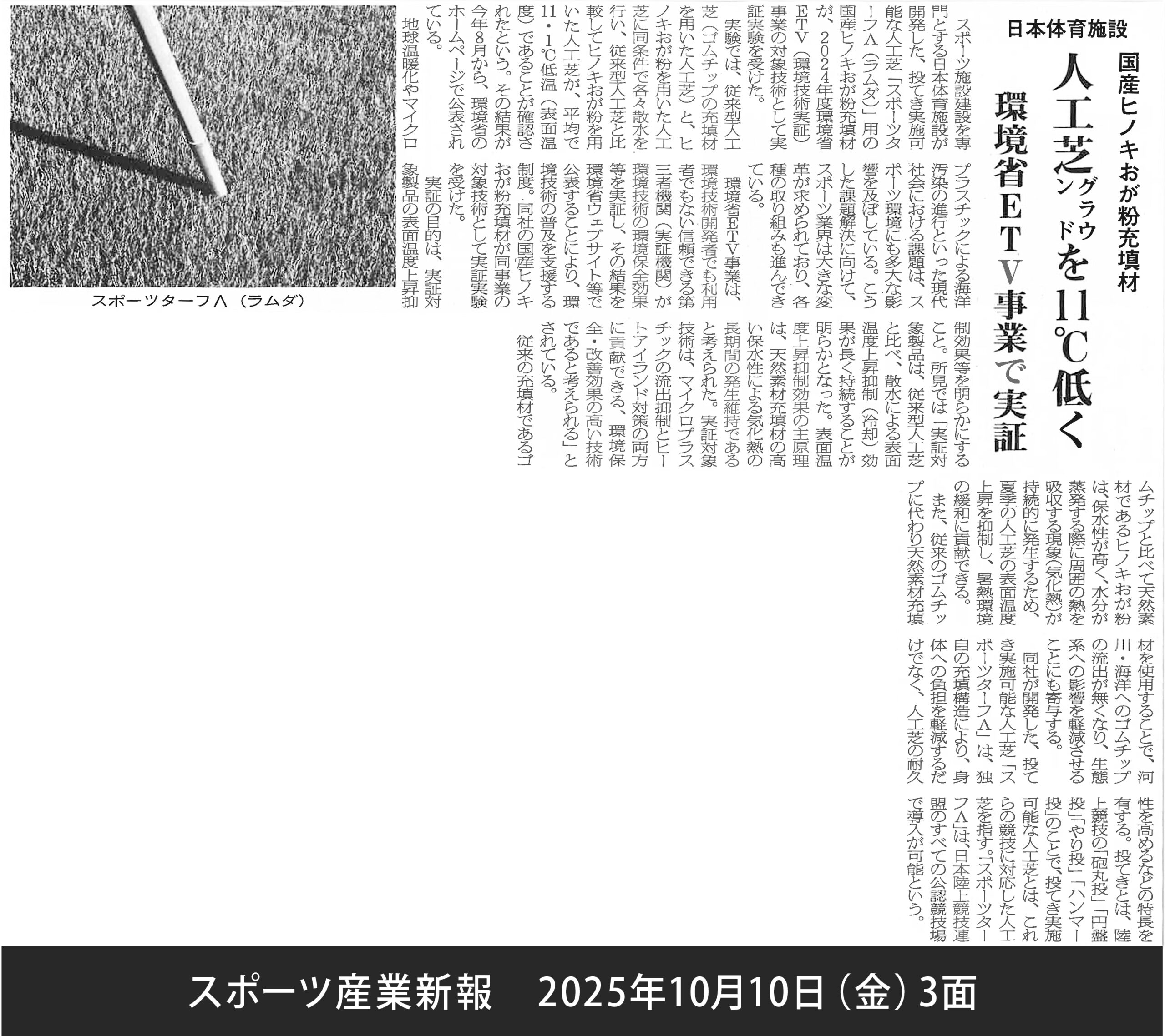 日刊建設工業新聞、建通新聞東京、スポーツ産業新報に当社が開発した投てき実施可能な人工芝『スポーツターフΛ(ラムダ)』の天然素材充填材『ヒノキおが粉』の記事が掲載されました。