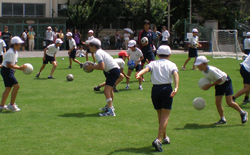 校庭は、コウライ芝とクレイ舗装のグラウンドです。今回の工事では、芝生舗装クレイ舗装、暗渠排水、砂場、防球ネット等の整備を行いました。